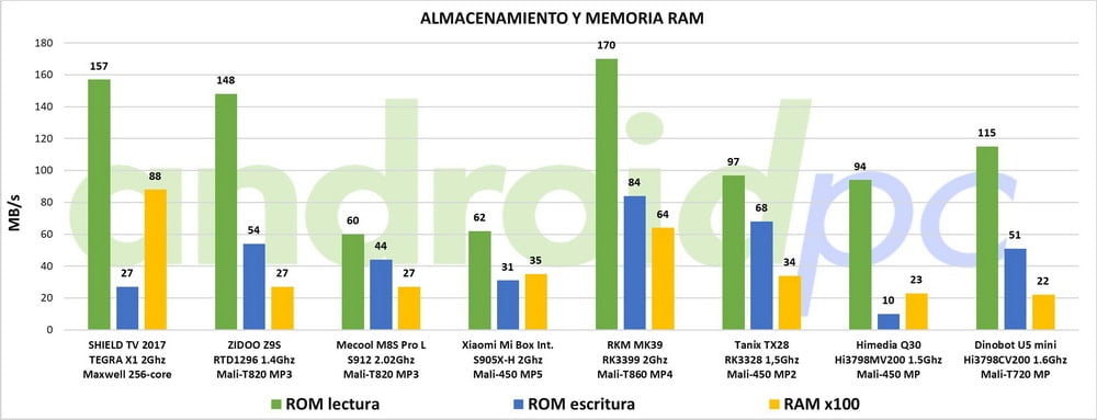 En el apartado de potencia el Dinobot U5 Mini tiene unos resultados aceptables gracias al SoC Hi3798CV200 Quad Core Cortex-A53 que se mueve entre 400 MHz y 1.6 GHz, en el apartado gráfico la potencia de la GPU Mali-T720 MP2 es suficiente para mover la mayoría de juegos o apps de Android, aunque los que tienen elevada carga 3D sufren un poco. Si comparamos los resultados podemos ver como queda por encima en algunos aspectos al SoC Amlogic S912 y por debajo del potente RK3399, supera claramente a todos los SoC Quad Core Cortex-A53 de la gama media como los S905X y el RK3328.
