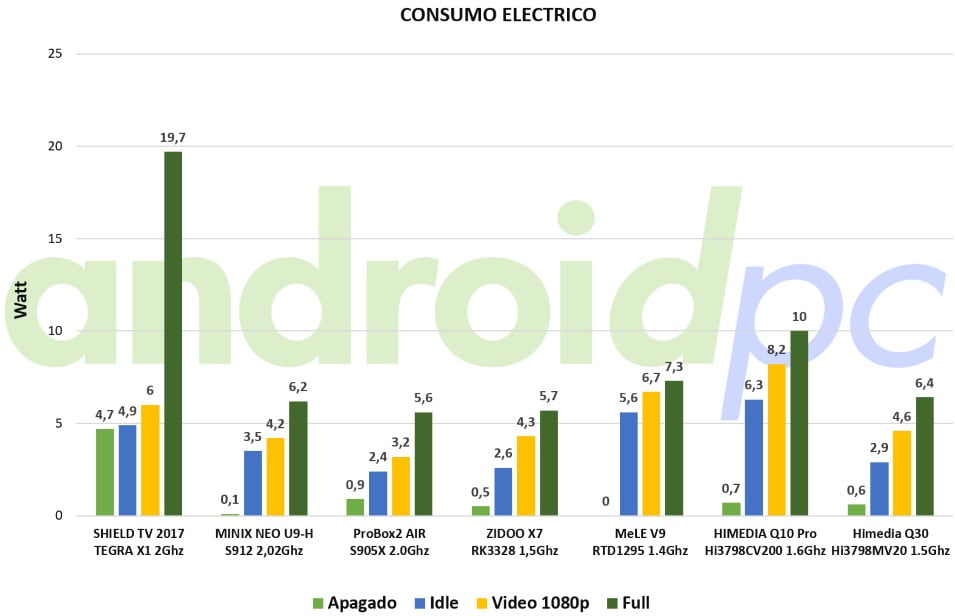 En cuanto al aspecto de consumo eléctrico del HIMEDIA Q30 utilizando el SoC Hisilicon Hi3798MV200 nos da unos resultados contenidos pero algo más altos por todo el hardware que integra este TV-Box, en maximo rendimiento el SoC llega a los 6,4 W de pico de consumo.