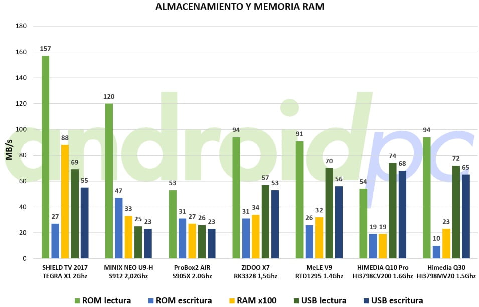 Sobre este dispositivo pasamos nuestros habituales test a la memoria y almacenamiento interno en el HIMEDIA Q30 usando el clásico app SD bench que nos da unas cifras bastante correctas en lectura pero bastante bajas en escritura. Desde el puerto USB 3.0 tenemos buenas velocidad y soporta sistema de ficheros EXT4, NTFS y exFAT sin problemas.