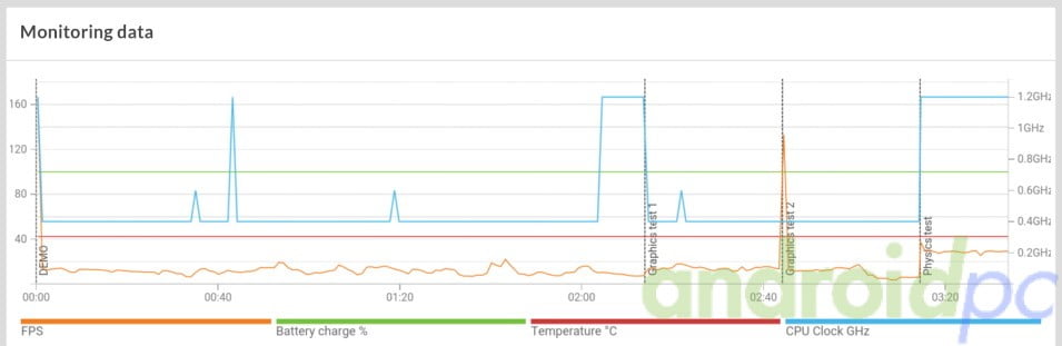 La caja metálica del HIMEDIA Q30 permite una disipación térmica muy buena y no hemos notado caídas de rendimiento en escenarios exigentes. Si miramos los datos de la prueba de 3DMark podemos ver que el procesador no pasa de los 1,2GHz como ya hemos comentado, el rendimiento se mantiene estable respecto a las pruebas.