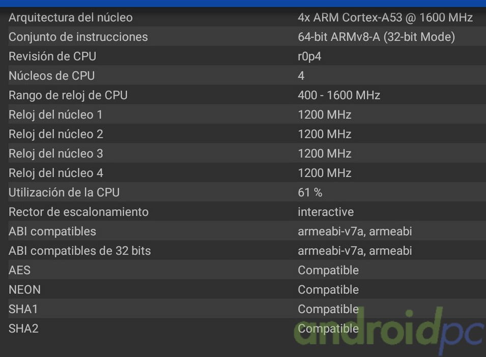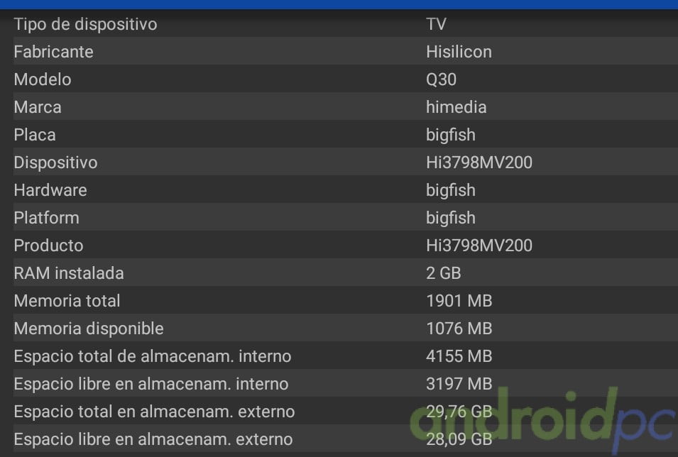 Como ya sabemos en este modelo HIMEDIA Q30 tenemos el nuevo SoC Hisilicon Hi3798MV200 que incluye cuatro procesadores ARM Cortex-A53 de 64bits aunque el sistema es en 32bit y una GPU Mali-450MP que hemos visto en infinidad de SoC como los similares Amlogic S905x y el Rockchip RK3328. Este modelo trabaja entre los 400 Mhz y los 1.6 GHz dependiendo de las necesidades de rendimiento del sistema aunque solo lo hemos visto llegar a los 1,2GHz.