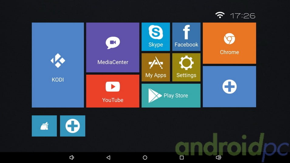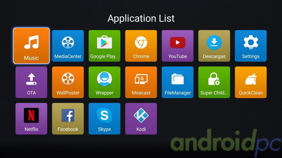 Si abrimos las lista de las aplicaciones instaladas por defecto podemos ver como el sistema está bastante limpio, no tendremos que eliminar ninguna app molesta del sistema ya que todas tienen una función. Por defecto tenemos unos gestores multimedia denominados Media center y Wallpaper, el Wrapper para cambiar el reproductor por defecto de Kodi, Miracast, explorador de archivos, Super Child para bloquear el acceso a niños, Quick Clean para limpiar la RAM, tambien tenemos apps como Chrome, Netflix, Facebook, Skype y Kodi.