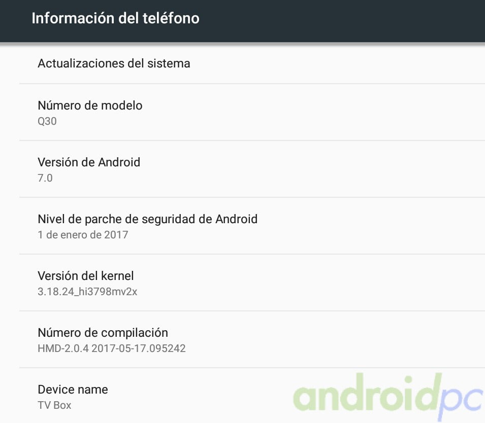 Como sistema operativo en el HIMEDIA Q30 tenemos instalado Android 7.0, un sistema a la última. El kernel no es de los ultimos ya que tenemos la versión 3.18.24, la compilación tiene fecha del 2017-05-17. Con esta versión hemos realizado la review que podéis leer en las siguientes páginas. El sistema se mueve de forma rápida y estable, no tenemos problemas de cierres de apps usando este firmware, las aplicaciones se ejecutan con normalidad sin congelaciones.