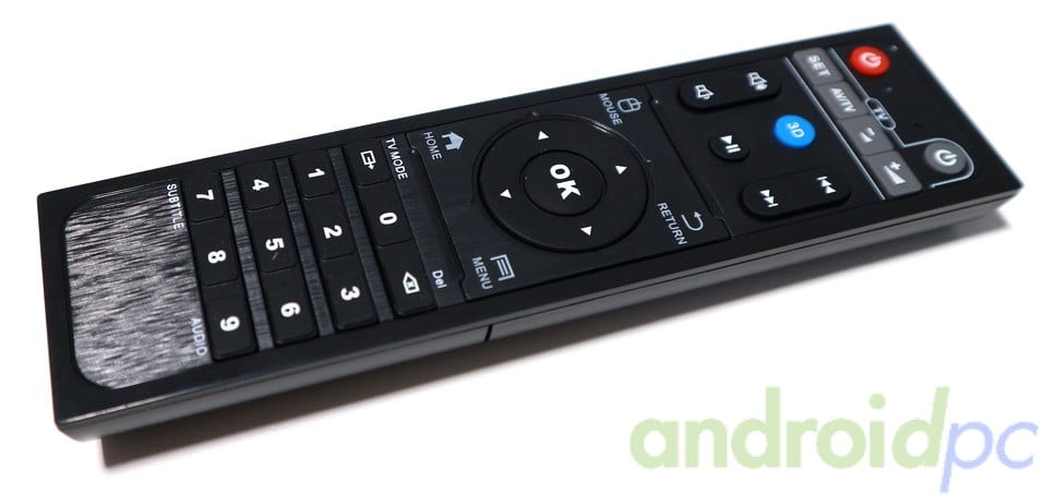Junto con el TV-Box HIMEDIA Q30 tenemos un mando a distancia IR que controla todas las funciones del TV-Box, se alimenta mediante dos pilas AAA. Aparte de las teclas habituales contamos con unas en la parte superior del mando que nos permite la opción de copia de teclas de otros mandos como por ejemplo el de nuestra TV, con la tecla TV Mode cambiamos la resolución y con el botón 3D activamos este sistema cuando tenemos ejecutado el reproductor de vídeo nativo.