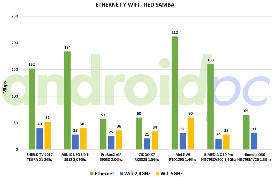En la placa del HIMEDIA Q30 tenemos de serie un adaptador inalámbrico Wifi b/g/n y también un puerto Ethernet 10/100, nos conectamos con un Router ASUS RT-AC1200G+, un equipo de gama media. Realizamos transferencia de archivos sobre una red SAMBA y conectado mediante Wifi 2,4Ghz hemos logrado una velocidad de unos 31 mbps, con el conector de red 10/100 utilizamos un cable de red de Categoría 6 para garantizar la velocidad, usando esta conexión alcanzamos unos 65 mbps. Unos resultados correctos para los adaptadores de red que monta este hardware pero hubiese sido interesante contar con Ethernet Gigabit y wifi de doble banda, hemos realizado varias transferencias larga sobre SAMBA y no parece que muetre caídas de rendimiento.