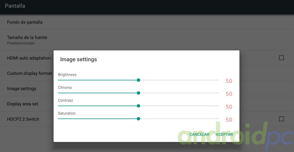 Dentro del menú Ajustes de Imagen tenemos controles para Luminosidad, Contraste, Tonalidad y Saturación, unos ajustes muy interesantes para dejar a nuestro gusto la imagen en pantalla, estos ajustes los tenemos tanto en Android como en el reproductor nativo.