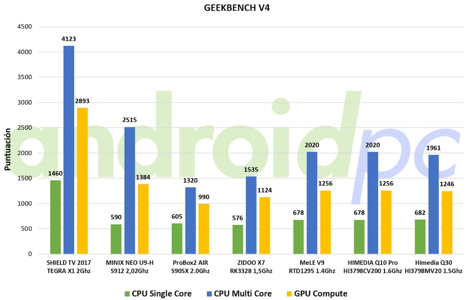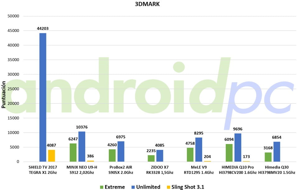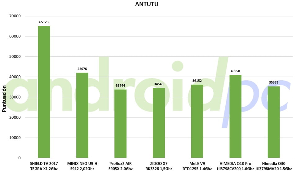 En cuanto a rendimiento en bruto el modelo HIMEDIA Q30 movido por el nuevo SoC Hisilicon Hi3798MV200 con cuatro procesadores ARM Cortex-A53 de 64bits y una GPU Mali-450MP nos da unos valores similares a sus rivales Amlogic S905x y el Rockchip RK3328. Podéis ver todos los detalles de este SoC en el articulo especial de comparativa que le hemos hecho respecto a los otros SoC con los que tiene que competir en el mercado actual. El sistema tiene un buen rendimiento gracias gracias a la estabilidad del sistema aunque se nota que a la hora de trabajar instalando apps o similar el almacenamiento interno no es el más rapido, por otra parte los 2GB de memoria RAM y la estabilidad del firmware con Android 7 hace que el conjunto marche sin problemas.