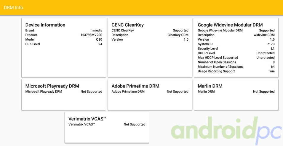 En el aspecto de certificados DRM necesarios para algunas apps de Streaming de pago como Google Video contamos con Google Widevine L1 pero como explicamos en la siguiente sección de servicios de streaming de pago esto NO nos permite ver Netflix en más calidad y seguiremos con calidad SD como pasa en todos los TV-Box que no aprueba Netflix personalmente tenga los permisos DRM que tenga.