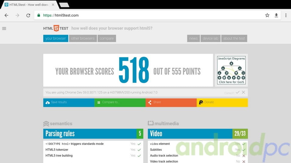 Este test nos da un valor del rendimiento del dispositivo sobre la navegación web (siempre usamos el navegador preinstalado) y el rendimiento bruto del SoC con una serie de test de calculo.