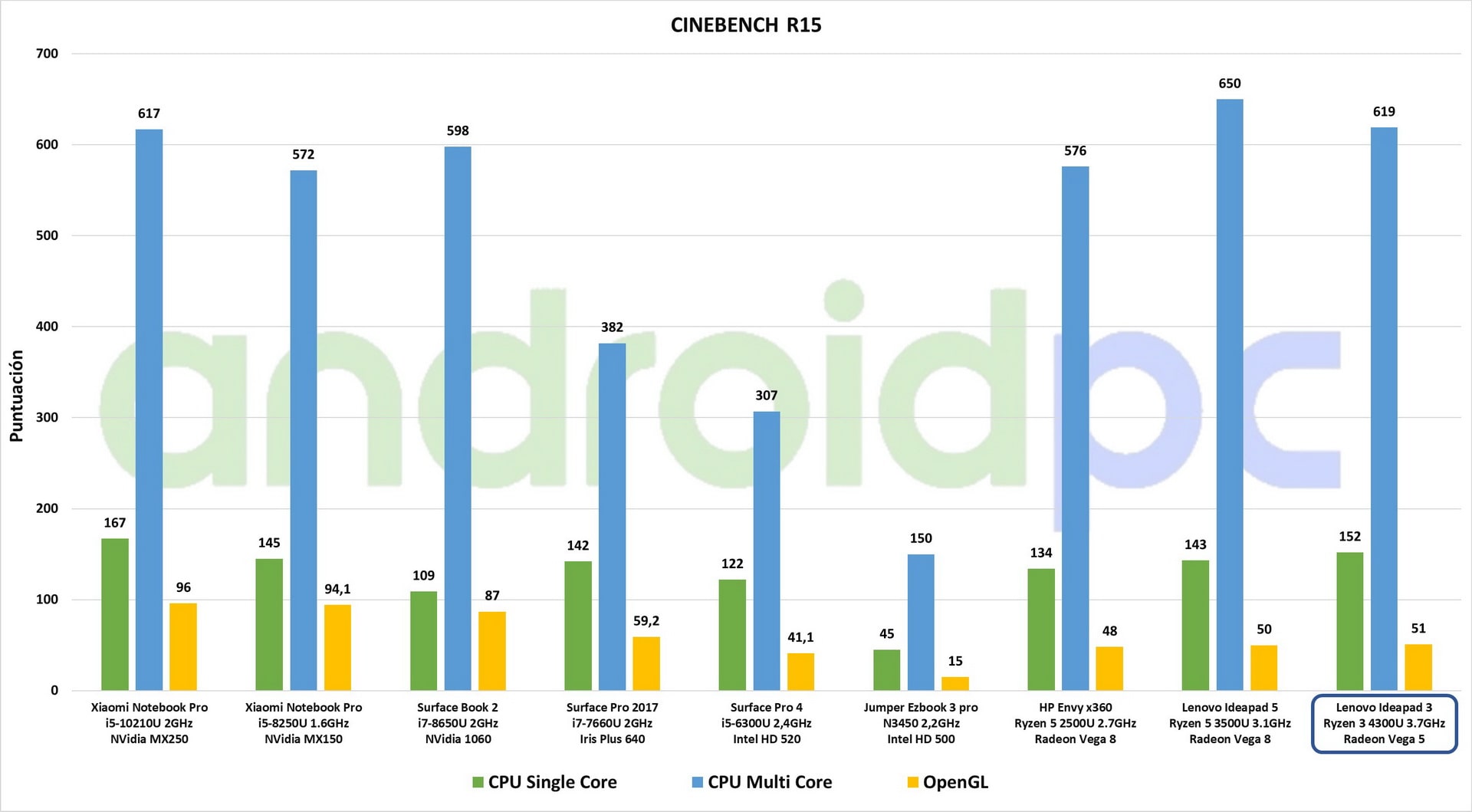 Como vemos en los test de rendimiento del Lenovo IdeaPad 3 14 con precesador AMD Ryzen 3 4300U queda a muy buen nivel y compite de directamente con los procesadores Intel Core i5 Gen10. Hay que contar además que la GPU ingrada Radeon Vega 5 deja totalmente atrás a cualqueir GPU Intel HD Graphics donde casi cualquier juego es directamente injugable.