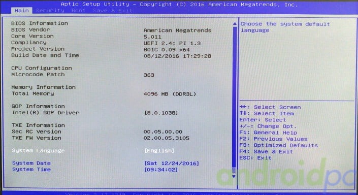 Podemos arrancar la BIOS del sistema repetidamente la tecla ESC mientra reiniciamos el miniPC. La BIOS del sistema es bastante clásica, tenemos las opciones habituales en este tipo de sistemas que están basados en una plataforma en principio destinada a tablets.