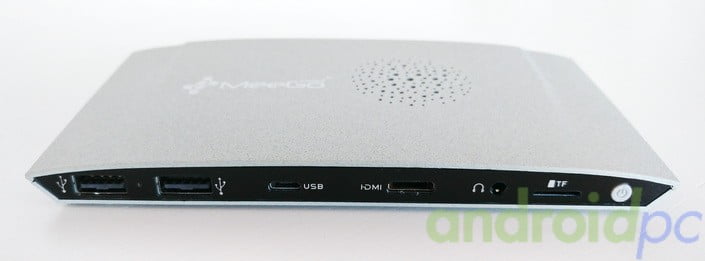 Como vemos el miniPC MeeGoPad T09 tiene unas dimensiones muy reducidas (156x54x15 mm) con un diseño curvo en su parte superior. Este modelo cuenta con una peculiar disposición de puertos, en la parte frontal contamos con dos puertos USB 2.0, un puerto microUSB de carga, conector microUSB para alimentarlo, jack de audio, lector de tarjetas microSD y botón de encendido.