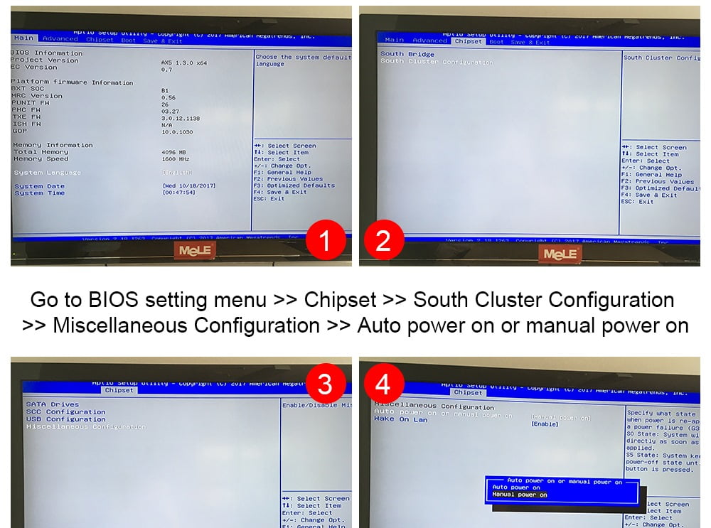 - BIOS > Chipset > South Cluster Configuration > Miscellaneous Configuration > Auto power ON/OFF