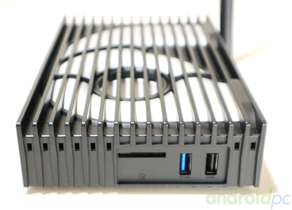 En la parte superior podemos ver el llamativo sistema de refrigeración pasiva, la CPU está en contacto con la pieza de aluminio que se ve entre las ranuras de la carcasa de plástico y envía el calor por los canales de su diseño hacia la parte de atrás o la irradia directamente.