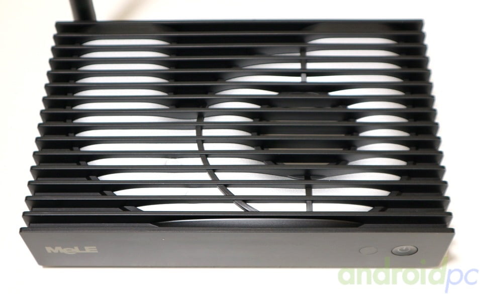 La caja del mini PC MeLE PCG35 Apo está realizada en plástico y aluminio, en la carcasa exterior tenemos una serie de ranuras para mejorar las térmicas, en la parte frontal vemos el logo de la marca, el botón de encendido y un receptor IR que no es funcional por desgracia.
