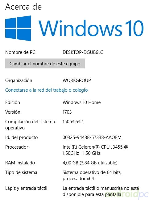Como vemos el sistema instalado es Windows 10 Home 64bit y detecta perfectamente el procesador Intel Celeron J3455 Quad core con su velocidad de 1,5 GHz, el sistema viene con la versión 1703 Creators update con lo que no tendremos que instalar muchos parches.