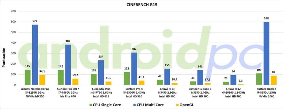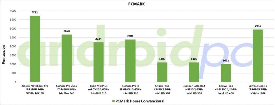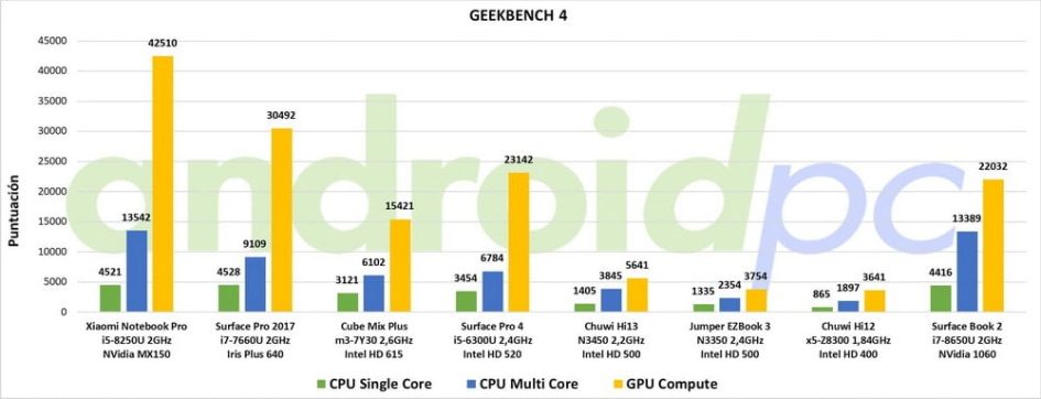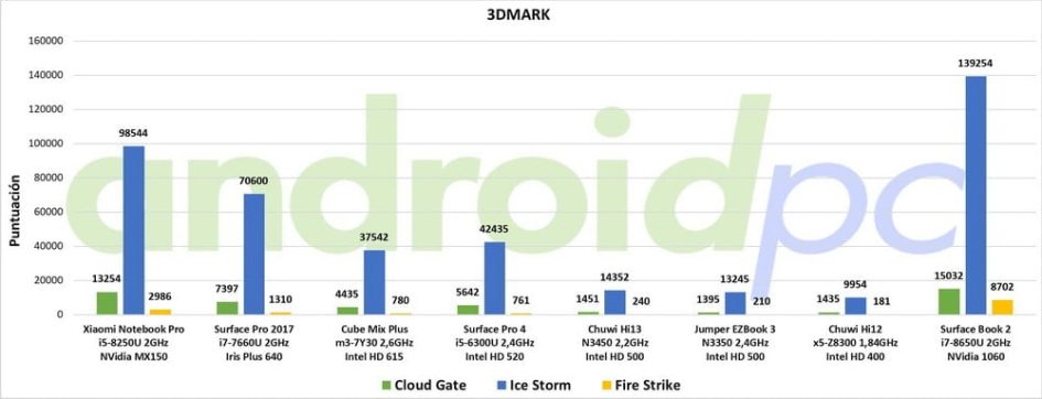 El 2 en 1 Microsoft Surface Book 2 cuenta con el procesador Intel Core i7-8650U de cuatro núcleos y ocho hilos que se mueve entre 1,9 y 4,2 GHz aunque normalmente se queda en los 2,5GHz. En el apartado gráfico tenemos dos GPU, la integrada Intel HD Graphics 620 se encarga del entorno del sistema y la reproducción multimedia, por otro lado tenemos una NVIDIA Geforce GTX 1060 con 6 GB GDDR5 dedicada a los juegos o aplicaciones 3D. Como vemos el rendimiento es excelente y tenemos unos resultados al maximo nivel comparándose con otros portátiles de diseño convencional.