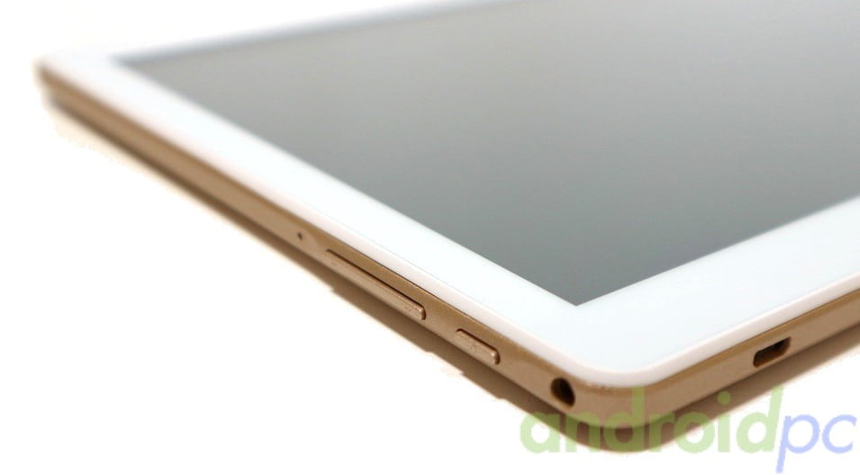 La tablet Onda V10 4G está fabricada plástico y aluminio de color dorado, tiene unas medidas externas de 240x190x8,3 mm y un peso de solo 490gr lo que la hace bastante ligera. La parte frontal tiene unos marcos contenidos en los laterales y grandes en la parte superior e inferior, en la parte superior podemos ver la cámara de 2 MP. La construcción general es correcta aunque al cogerla hace ruidos ya que no tiene un cuerpo muy rígido, la pantalla no es laminada y se aprecia claramente la separación de la pantalla.