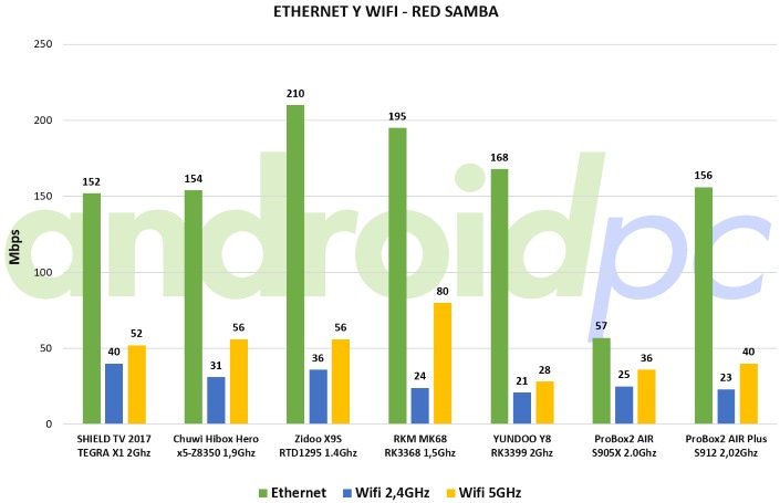 El ProBox2 Air Plus cuenta con un adaptador inalámbrico Wifi ac de Doble Banda y puerto Ethernet Gigabit, con ellos hemos conectado con un Router ASUS RT-AC1200G+, un equipo de gama media. Realizamos transferencia de archivos sobre una red SAMBA y conectado mediante Wifi 2,4Ghz hemos logrado una velocidad de unos 23 mbps, con la red de Wifi 5Ghz alcanzamos unos 40 mbps un valor bastante más alto que el anterior. Este modelo dispone de un conector de red Gigabit con el que utilizamos un cable de red de Categoría 6 para garantizar la velocidad, usando esta conexión alcanzamos unos 156 mbps lo que es una buena cifra. Unas velocidades que se como vemos mejoran bastante al modelo anterior.
