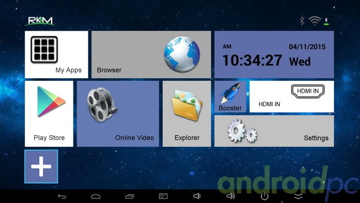 Conectamos a la corriente el RKM R1 y el sistema NO arranca de forma automática, hay que pulsar el botón de encendido. El launcher por defecto es bastante básico y se basa en cuadrados simples para arrancar aplicaciones o activar la señal HDMI. En la parte inferior tenemos una barra que podemos personalizar con accesos directos a nuestras aplicaciones pulsando el icono +.