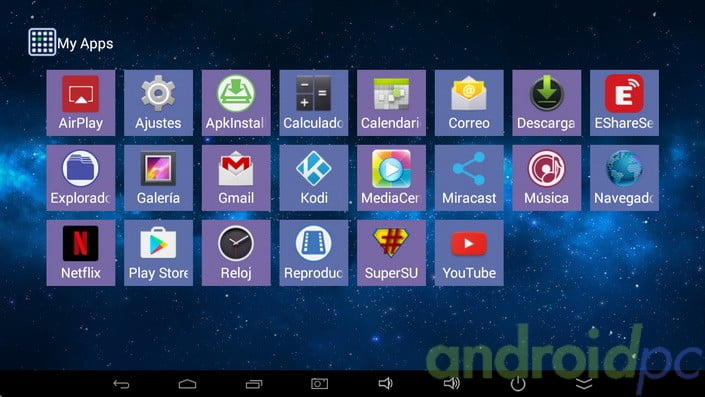 En la lista de aplicaciones instaladas por defecto encontramos pocos app, tenemos KODI, Netflix, un app de limpieza, EShare para control remoto, AirPplay para streaming desde iOS y Miracast.