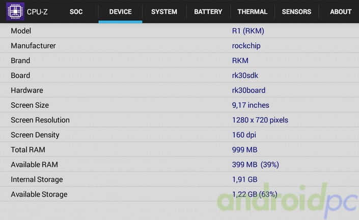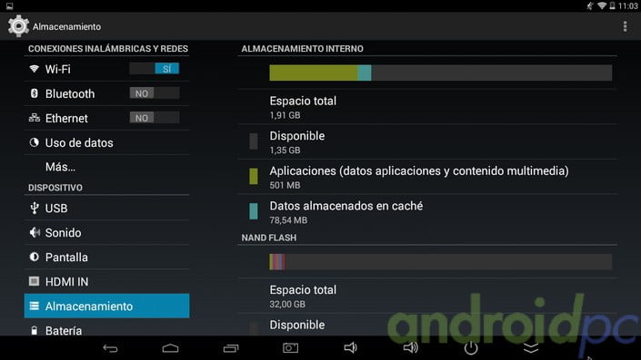 En el RKM R1 tenemos un sistema antiguo de dos particiones, tenemos una ridícula partición primaria de 2 GB de memoria de almacenamiento NAND, de los cuales nos quedan unos 1,35 GB, una cifra corta para instalar apps. Luego tenemos otro modulo de 32 GB NAND de almacenamiento secundario que si tenemos totalmente disponible pero claro, no es primario, una lastima. En este hardware tenemos también 1 GB de memoria RAM DDR3 que es nos limita a la hora de navegar con muchas pestañas o ejecutar muchas apps.