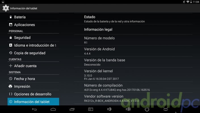 Instalado en el RKM R1 tenemos como sistema operativo Android 4.4.4, un sistema bastante antiguo que debe ser el más moderno que acepta el SoC que monta este TV-Box. El kernel es el 3.10.0 y la compilación tiene fecha del 2017-01-06, con esta versión hemos realizado la review que podéis leer en las siguientes páginas.