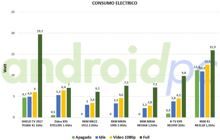 En cuanto al consumo eléctrico el RKM R1 como es lógico es superior al de otros TV-Box ya que tiene que alimentar un proyector LED. El valor que veis en apagado es la potencia que se destina a cargar la batería mientras el sistema está sin funcionar. Las temperaturas son correctas y el ventilador cumple la función para la que está destinado. Por otro lado acústicamente el sistema es sonoro pero no molesta en exceso comparado con otros proyectores que hemos analizado, aún así acostumbrados a TV-Box totalmente pasivos si que notamos el ruido, si lo vamos a usar para ver películas quizás es interesante colgarlo del techo y alejarlo.