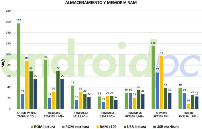 Realizamos nuestros test de la memoria y almacenamiento sobre el RKM R1 usando el app SD bench que nos da unas cifras correctas para el hardware que monta. Como podemos ver los valores son bajos y esto nos limitará el rendimiento máximo, hay que tener en cuenta que el uso de Android en este box no será muy intensivo aparte de ver películas, KODI, Youtube y demás, algo para lo que nos es suficiente.