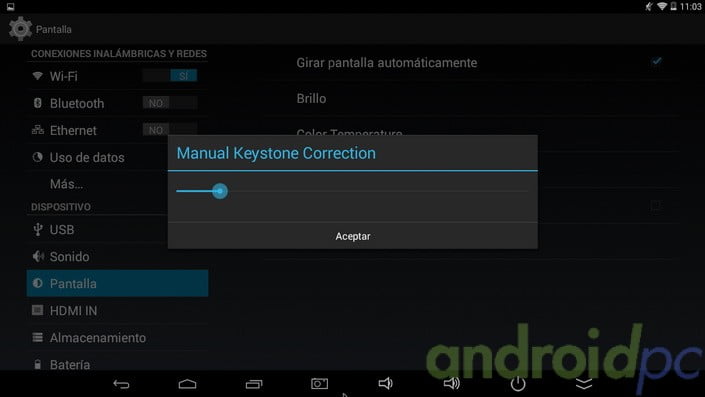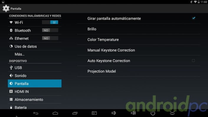 Dentro de los ajustes del sistema del RKM R1 tenemos varios controles para gestionar el proyector, con Brillo podemos regular la potencia lumínica y con Control de Temperatura podemos ajustar la gama de colores aunque no notamos que afecte mucho.