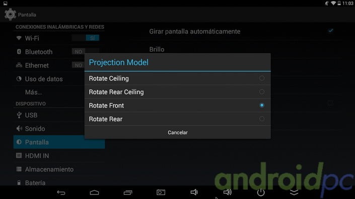 En el menú Projection Model contamos con varias opciones, con ellas controlamos cómo se proyecta la imagen y podemos por ejemplo darle la vuelta por si colgamos del techo el proyector o lo ponemos de lado.