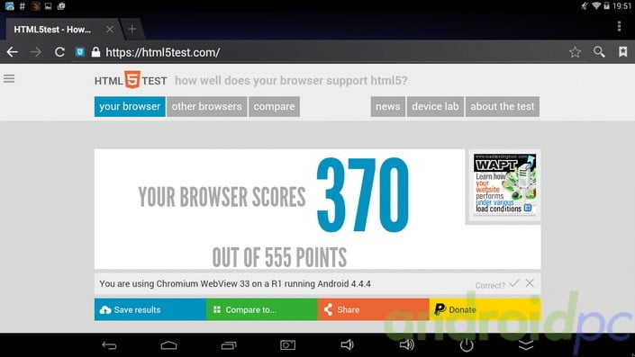 Este test nos da un valor del rendimiento del dispositivo sobre la navegación web (siempre usamos el navegador preinstalado) y el rendimiento bruto del SoC con una serie de test de calculo.