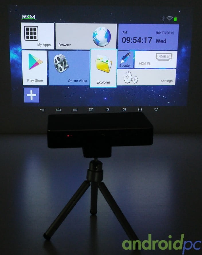 En el RKM R1 tenemos un proyector DLP, con un panel 0.3′′ DMD, con luz LED que según sus especificaciones tiene 1000 Lumens, contraste 2000:1, su óptica que tiene una resolución nativa de 854×480 píxeles, foco manual y el tamaño de pantalla puede ir de las 30 a las 120 pulgadas con un rango de proyección de entre 1 y 5m. En el lateral del proyector tenemos una rueda que nos permite ajustar la distancia focal para ver la imagen clara respecto a la distancia de la pantalla.