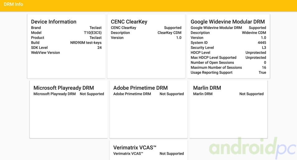 En el aspecto de certificados DRM necesarios para algunas apps de Streaming de pago contamos con Microsoft Widevine L3 que nos da compatibilidad con algunos servicios de pago, como novedad vemos que disponemos de CENC ClearKey.