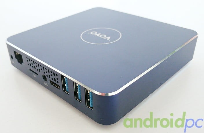 La caja del miniPC Voyo V1 está realizada en aluminio en la parte exterior y en la zona superior encontramos en logo de la marca. En la parte frontal tenemos un pequeño led de estado y un botón de encendido que se comporta con normalidad.