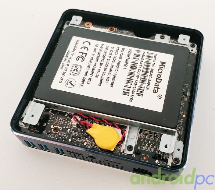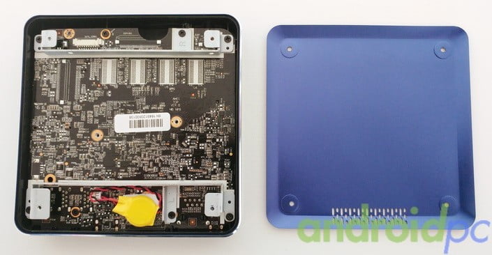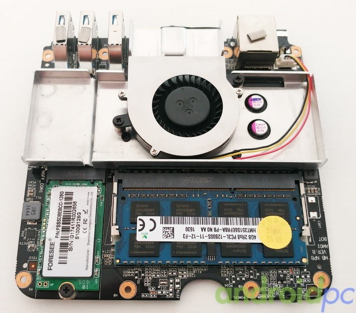 Si desmontamos la placa podemos ver el ventilador con una caja de aluminio que sirve de canalización, en la parte frontal encontramos el disco M.2 Foresse de 128GB y un único módulo de memoria de 4GB de RAM DDR3L 1600MHZ a 1.35V.