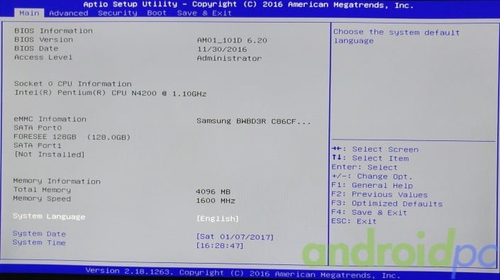 Podemos arrancar la BIOS del sistema repetidamente la tecla ESC mientra reiniciamos el miniPC, la BIOS del sistema es bastante sencilla y no ofrece opciones especiales, solo podemos cambiar el sistema de arranque.