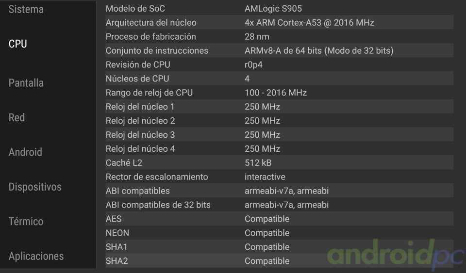 Como se anuncia en las especificaciones el Xiaomi Mi Box International Version incluye un SoC S905X-H de AMLogic con cuatro procesadores ARM Cortex-A53 que llegan a una velocidad máxima de 2,02GHz y una mínima de 100MHz mientras como GPU tenemos una Mali-450MP5. Como veremos en los test de rendimiento el sistema está muy bien optimizado y tenemos un rendimiento excelente.