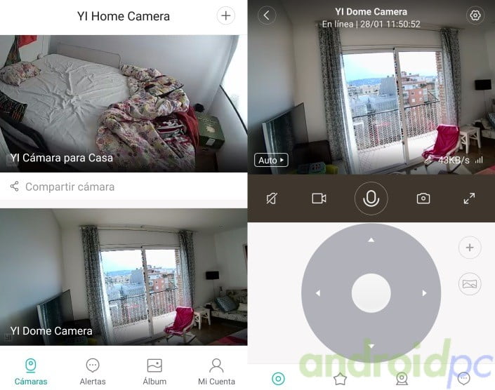 Cuando ya tenemos conectada la cámara nos saldrá en la pantalla inicial de nuestro app de control, se muestra una imagen estática de la última sesión. Si tenemos varias cámaras Yi podemos elegir la que queremos usar pulsando en la imagen, entramos en el streaming en directo de nuestra Yi Dome Camera 1080p y en la parte inferior vemos las flechas de control de movimiento para rotarla.