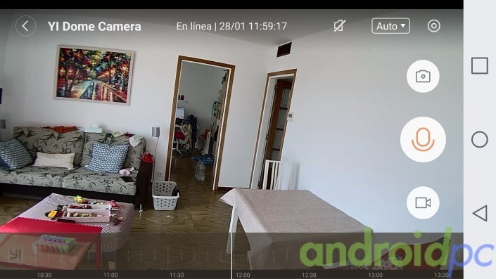 Como vemos el interface de la aplicación es muy sencillo, en la zona inferior tenemos una escala de tiempo donde si se ha detectado actividad se marca en rojo y moviendola podemos ver el video de lo que ha sucedido. Tenemos también botón para grabar vídeo, capturar una fotografía y activar el altavoz para comunicarnos. Podemos ajustar la calidad del streaming entre SD, HD o dejarlo en Auto dependiendo del ancho de banda.