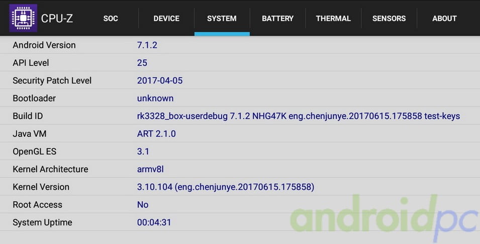Como sistema operativo en el ZIDOO X7 tenemos instalado Android 7.1.2, un sistema a la última. El kernel como vemos es bastante antiguo, concretamente el 3.10.104 y la compilación tiene fecha del 2017-06-15. Con esta versión hemos realizado la review que podéis leer en las siguientes páginas.