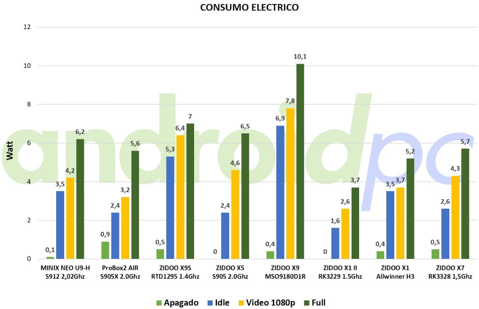 En el apartado del consumo eléctrico del ZIDOO X7 utilizando el SoC Rockchip RK3328 nos da unos resultados bastante contenidos en la linea de otro SoC similares, en maximo rendimiento el SoC llega a los 5,7 W de pico de consumo. La temperatura de la caja se mantiene baja y no hemos notado perdida de rendimiento ejecutando aplicaciones de uso intensivo.