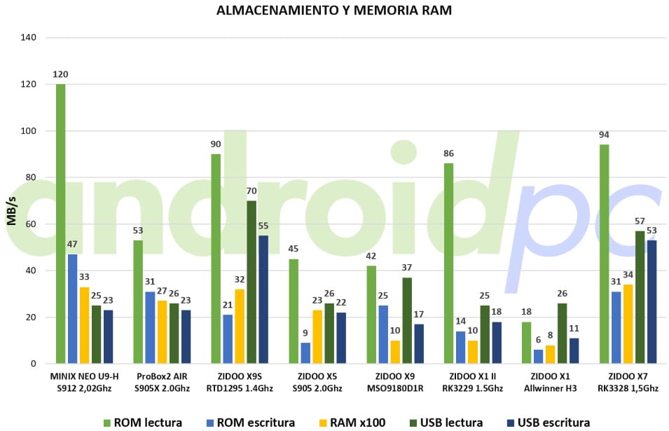 Pasamos nuestros test a la memoria y almacenamiento interno en el ZIDOO X7 usando el app SD bench que nos da unas cifras bastante buenas tanto en lectura como en escritura, como vemos han montado una memoria bastante rápida.