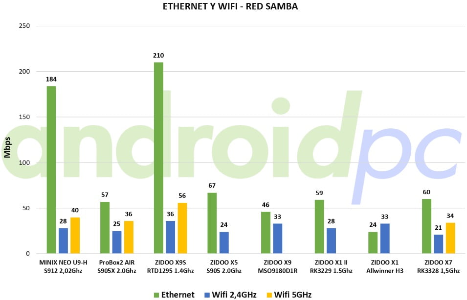 Integrados en la placa del ZIDOO X7 tenemos un adaptador inalámbrico Wifi ac de Doble Banda y también un puerto Ethernet 10/100, con ellos hemos conectado con un Router ASUS RT-AC1200G+, un equipo de gama media. Realizamos transferencia de archivos sobre una red SAMBA y conectado mediante Wifi 2,4Ghz hemos logrado una velocidad de unos 21 mbps, con la red de Wifi 5Ghz alcanzamos unos 34 mbps. Este modelo dispone de un conector de red 10/100 con el que utilizamos un cable de red de Categoría 6 para garantizar la velocidad, usando esta conexión alcanzamos unos 60 mbps. Unos resultados correctos dentro de este protocolo aunque siempre iría mejor Ethernet Gigabit de serie.