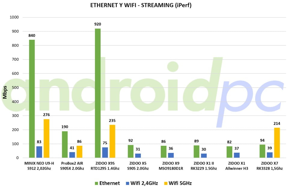Poniendo a prueba los adaptadores de red en uso de streaming utilizamos la herramienta de medición iPerf con la que tenemos la velocidad máxima de conexión en cada tipo de red. Con esta cifra tenemos hasta dónde podemos llegar usando las conexiones disponibles, el rendimiento final dependerá de nuestro proveedor de internet, la velocidad contratada, la distancia de nuestra red wifi, cableado Ethernet y otros factores. Los resultados son correctos y sin duda destaca el adaptador Wifi 5GHz que nos da más rendimiento que el puerto Ethernet 10/100 el que sin duda a dia de hoy está desfasado en comparación.