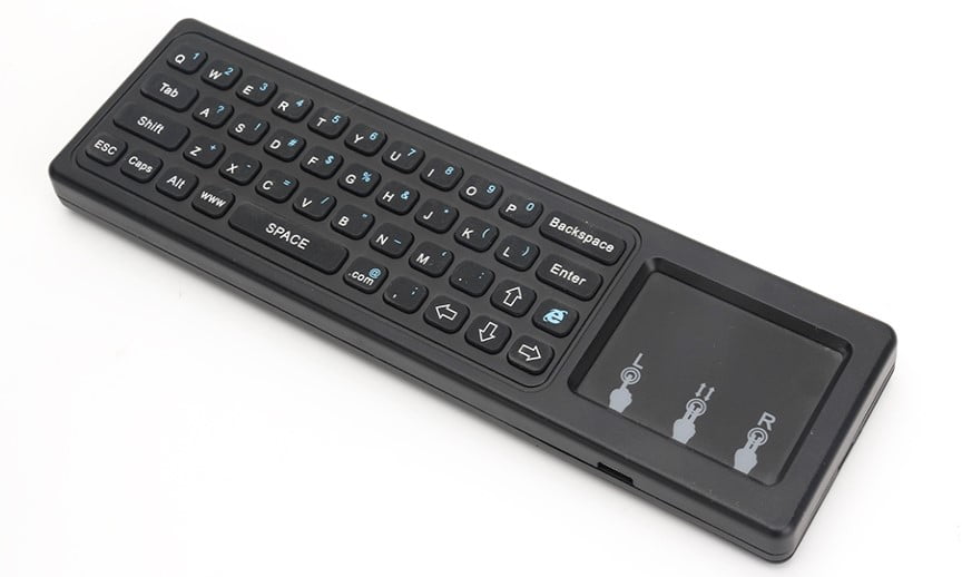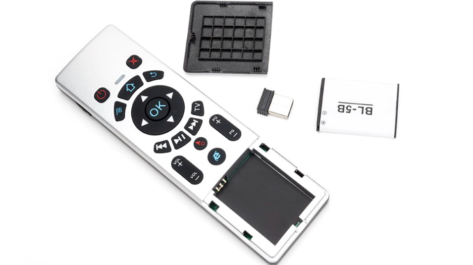 T6 es el típico Flymouse con el que controlamos el puntero moviendo el mando, cuenta con un pequeño teclado completo en una de sus caras con touchpad mientras en la otra tenemos las teclas de función para utilizar el modo flymouse con bastantes teclas de acceso directo por cierto. La comunicación con nuestro equipo ya sea miniPC, AndroidPC, consola… se realiza mediante un pequeño adaptador USB RF y se alimenta con una batería BL-B5 que se aloja en su carcasa y que es recargable por el puerto microUSB que incorpora.
