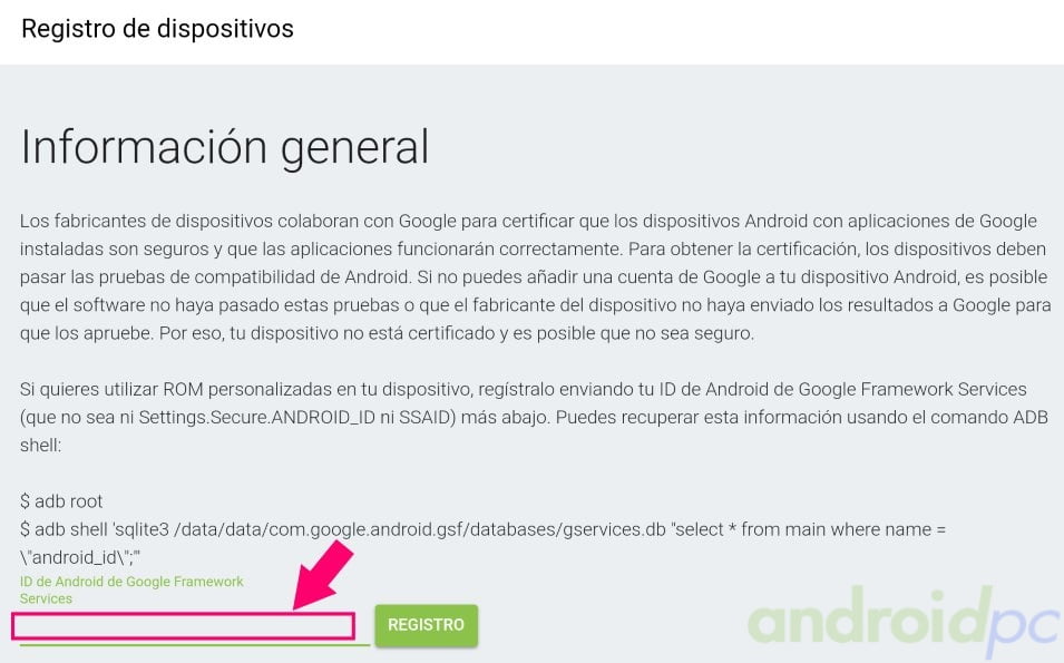 2. Nos aparecerá una pagina web donde se nos pide un numero «ID de Google Services Framework»