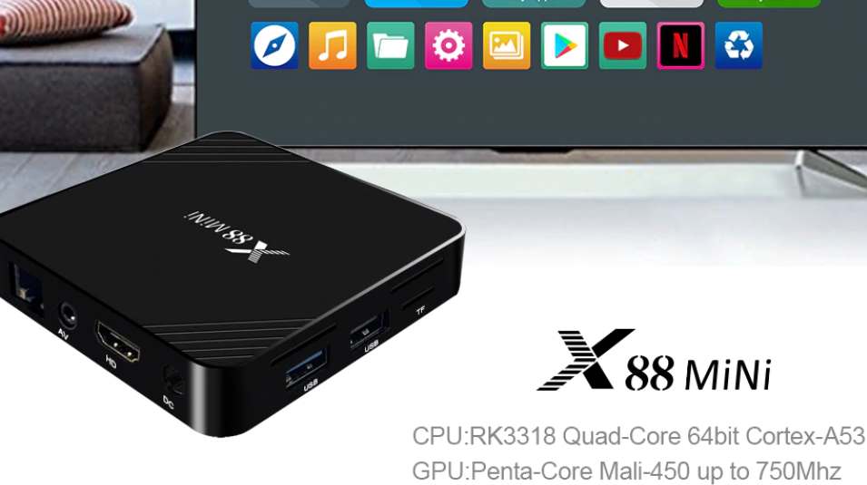El  Box barato X88 Mini integra como motor el nuevo SoC Rockchip RK3318, que tiene cuatro procesadores ARM Cortex-A53 capaz de llegar a los 1,5Ghz y una GPU Mali-450mp5 que incluye decodificación nativa de vídeo H.265 y VP9 hasta en resoluciones 4K@60fps HDR. Dispone de  2GB de RAM DDR3 y 16GB de memoria de almacenamiento eMMc que podemos ampliar añadiendo una tarjeta de memoria en el lector de tarjetas microSD incluido.
