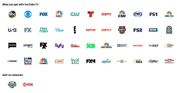 De momento hay confirmados unos 40 canales de TV como ABC, CBS, FOX y NBC, FX, ESPN y Fox Sports entre otros. También se incluyen canales de TV locales y algunos canales de cable.